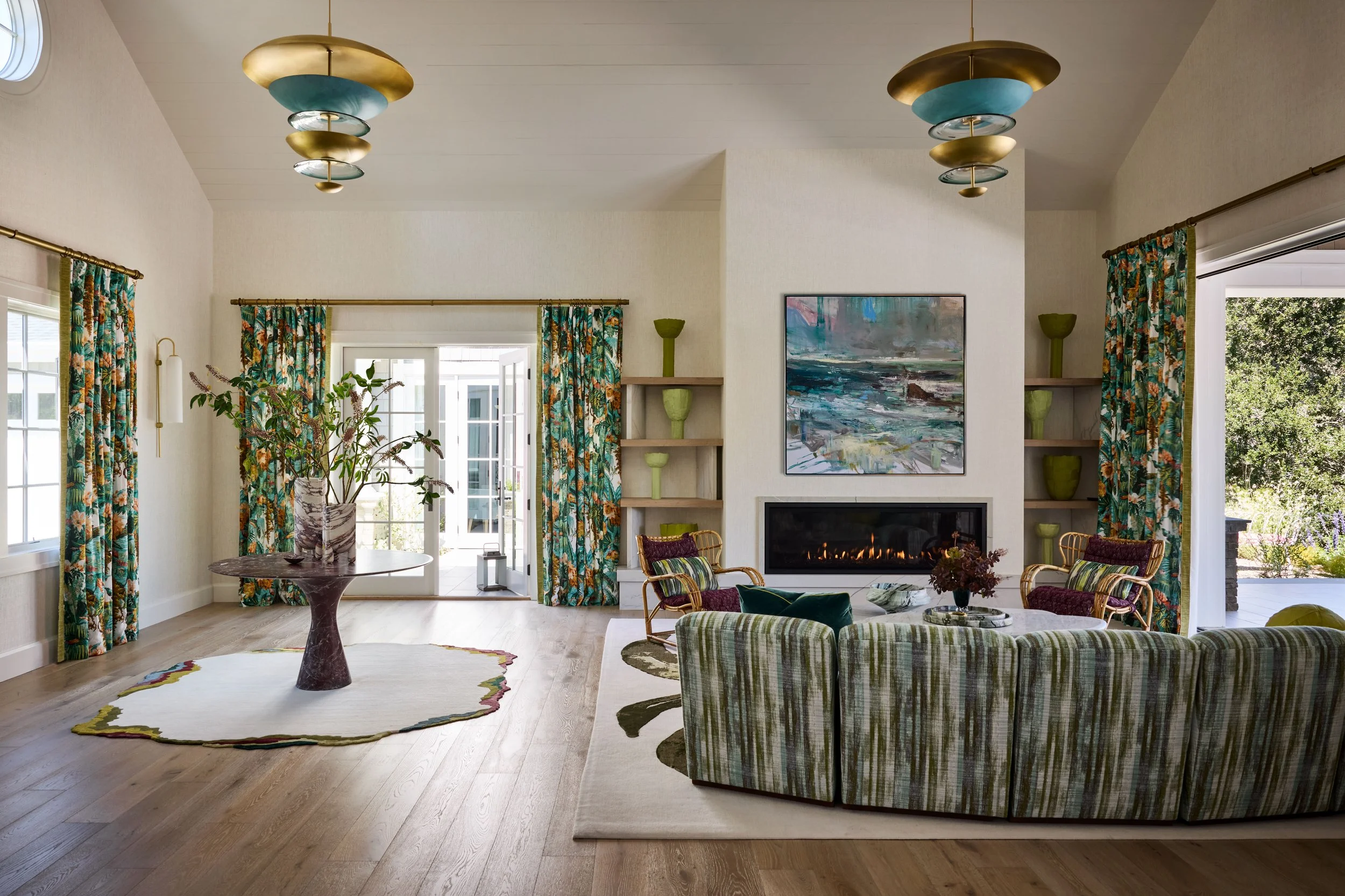 Vibrant textiles, sculptural lighting, and custom furnishings define the interiors. A curved greenstriped sofa arcs playfully across a botanical rug, while floor-to-ceiling draperies in lush Pierre Frey prints bring the landscape indoors. Overhead, turquoise-and-brass Atelier 001 pendants act as luminous jewelry. The project’s devotion to French textile house Pierre Frey became such a defining through line that we jokingly began calling it “the house that Pierre Frey built.”